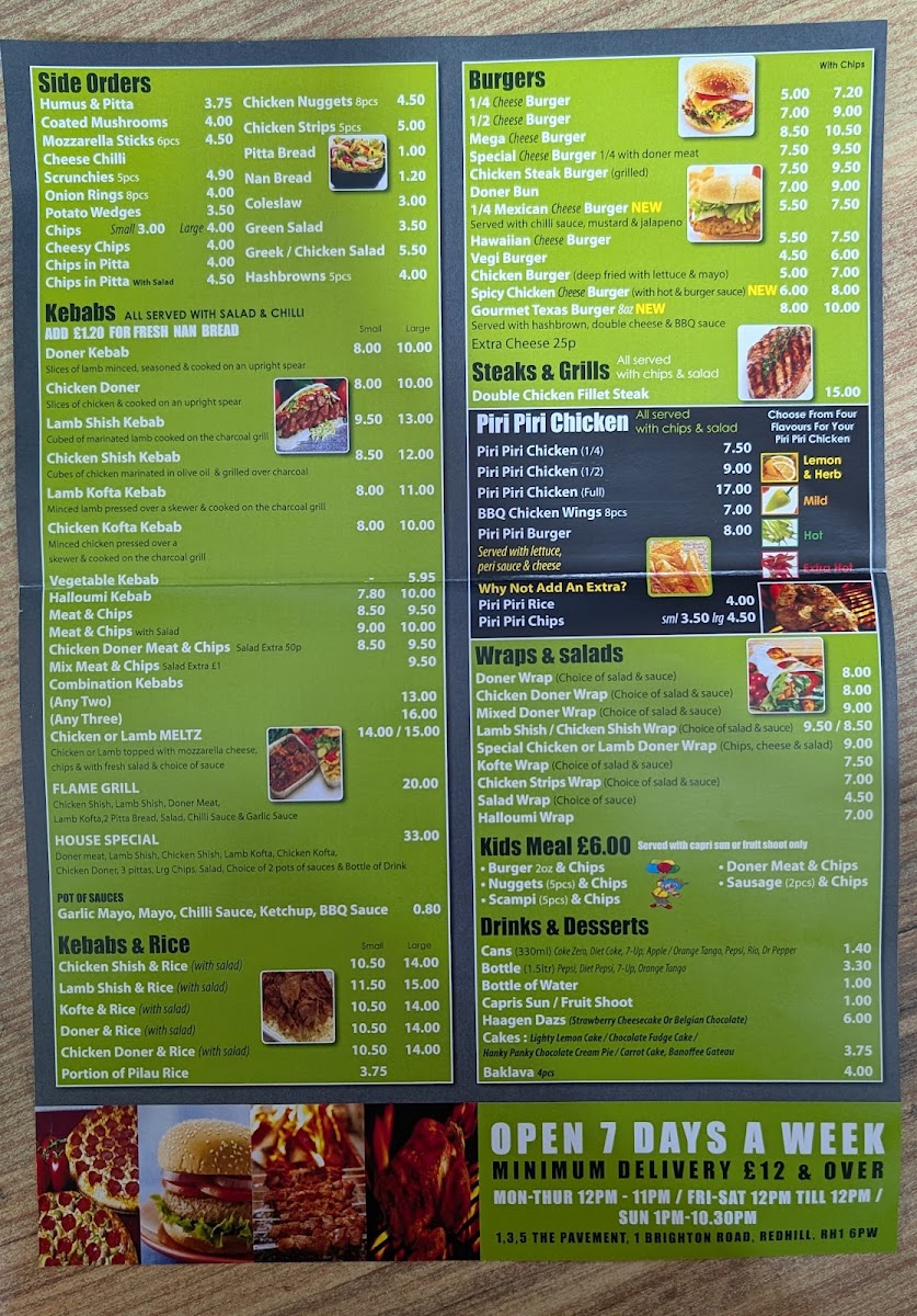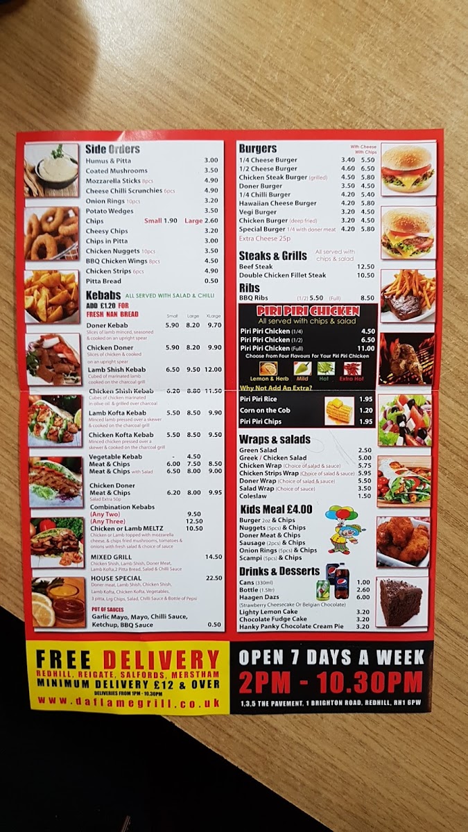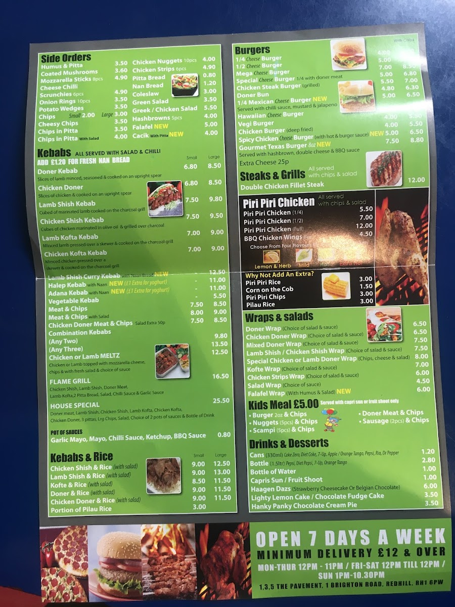 From a reviewer’s perspective, the menu at Flame Grill feels well-structured and confidently focused on crowd-pleasing comfort food, making it an appealing choice for a wide range of diners. The core of the menu clearly revolves around flame-grilled favorites, with KEBABS taking center stage through options such as COMBINATION KEBABS, KEBABS AND RICE, and classic KEBABS, all of which highlight generous portions and bold, smoky flavors. For those looking for familiar fast-food staples, the BURGERS category adds balance to the menu, while PIZZAS provide an easy, shareable alternative suitable for groups or casual meals. The inclusion of PIRI PIRI CHICKEN brings a welcome spicy kick, adding variety and depth to the overall offering. Families are also thoughtfully considered with KIDS MEALS, complemented by a POT OF SAUCES that allows diners to customize flavors to their liking. Overall, the menu feels cohesive and practical, emphasizing variety without being overwhelming, and successfully wrapping up the dining experience with a clear identity centered on grilled, hearty, and satisfying dishes.